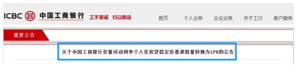 关于中国工商银行存量浮动利率个人住房贷款定价基准批量转换为LPR的公告