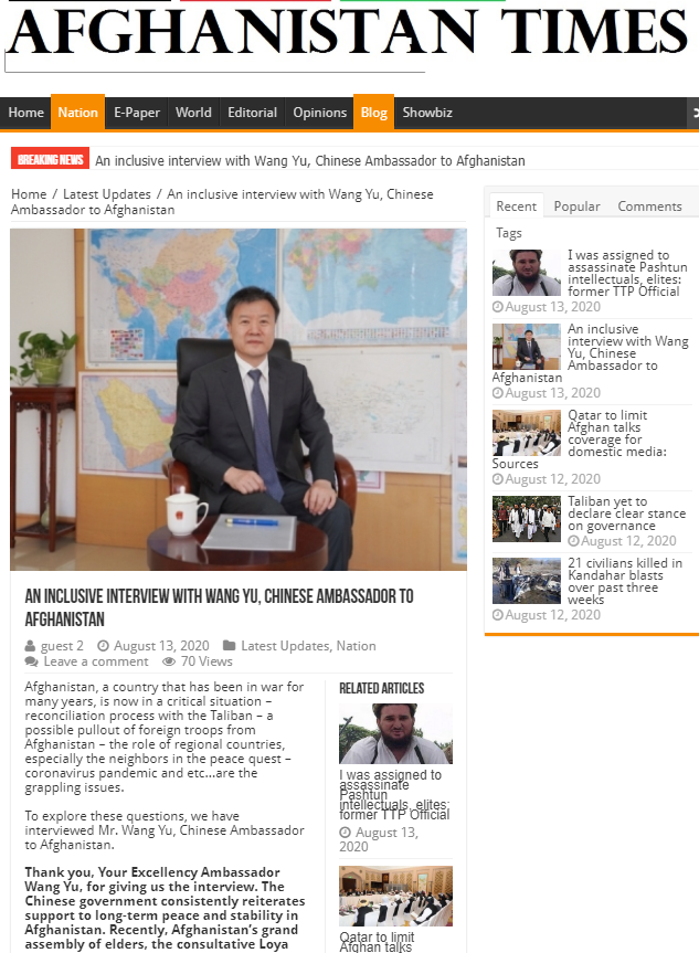 8月12日,驻阿富汗大使王愚接受阿主流媒体《阿富汗时报》书面采访,阐述中方在阿和平和解进程立场,介绍香港国安立法、新疆问题、中阿抗疫和经济合作情况等,强调中国共产党的领导和中国社会主义制度的优势是中国疫情防控阻击战取得重大战略成果、统筹推进疫情防控和经济社会发展工作取得积极成效的根本原因。《阿富汗时报》于13日发表了采访稿,有关内容如下: