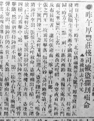 随后,非常方便地在《申报》中找到95年前题为《昨午厚丰庄栈司被盗拦劫殉命,并被劫去八千元》报道,原文如下:“昨日上午十一点半,北京路福兴里5号半厚丰庄派张顺生(注:有误,应为“张润生”,下同)至外滩中国银行支取钞洋八千元。持票而归(注:持钞洋送客户)。行经河南路,过报警处约五六门面,突来盗匪六七名,一戴西式呢帽,身穿直贡呢马挂及布长袍者,遽向张迎面一拳,击中口部,下手甚重。张之门牙一枚为其击落。知事不妙,急向路旁第三百二十三号门牌之仁寿轩笺扇店避入,盗亦跟踪而入,喝令将钞洋交出。张情急大呼救命。盗即袖出手枪,向之开放,仁寿轩之店伙,见状纷纷向后楼上奔逃。盗连放四枪,均为命中。第一枪击于执钞票之左手臂上,臂骨击断。然张犹坚持钞洋不放。第二枪中右乳上胸部内,弹未穿出,而钞洋仍不放手。及第三枪弹由左边颈项间穿出,第四枪由右边鼻端边打进,左面皮穿出,左腮皮肉全击腐。始因不支倒地,盗乃夺取其手中之蓝色花旗布包袱,内储钞票洋八千,携之出门,授予另一盗匪,仓皇向天后宫桥(注:河南北路)方向逃去。仁寿轩店伙闻声已寂,始出店堂,则张顺生已身卧血泊中,而有垂毙之势,急报斜对面报警处。一面将受伤人车送仁济医院,途中气绝而死。乃改送验尸所,候礼拜一验尸。事后,捕头往出事地点查勘,检得手枪弹壳数枚,带回捕房存查。厚丰庄经理罗稚云闻讯,除设法办理善后诸事外,并报告钱业公会,闻钱业公会将召集会议,有所讨论。已死之栈司张顺生,年三十岁,在厚丰庄作事已三年,家属于宁波城内,父母俱健在,有二兄及一弟、妻一(注:时已孕晚期,因丧夫之哀,后致男婴流产夭折),生二女(注:有误,实为生一女),赖其度日,不幸遭此意外。诚惨剧也。闻张平日为人极忠诚,该钱庄上下职员均称美之。即此次事变,若不忠于厥职,臂背已断钞洋犹不放手,不致死于非命,故经理罗君,将厚恤其家属,以慰死者云。”(《申报》,1925.12.13)。该报道系记者在抢劫枪杀案次日见报的报道,匆忙之际,细节上处难免有误,为此,笔者据实分别作了注释。