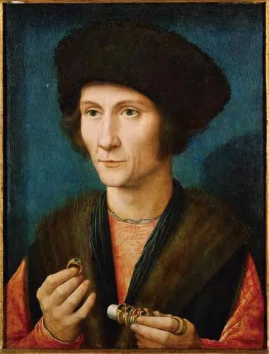 13世纪上半叶英格兰最为著名的教会金匠是埃塞克斯郡的华特(Walter ofColchester),1243年英格兰国王亨利三世请他以黄金和各种珠宝制作了坎特伯雷大教堂的圣体龛。金匠们一技傍身、衣食无忧。1500年左右布鲁日画家杰拉德•大卫(Gerard David)画下了金匠的生活。上方画中的金匠头戴珍贵的水獭皮毛帽子,身披羊毛坎肩,左手握着一串套满宝石金戒指的纸卷,右手拿着一枚蓝宝石戒指,仿佛正在向他的顾客介绍自己的杰作。