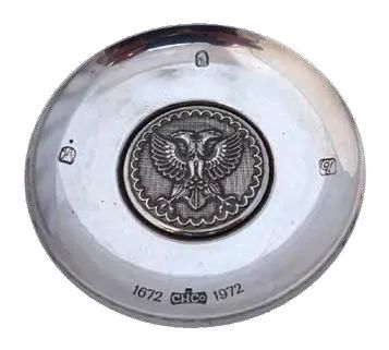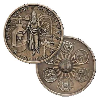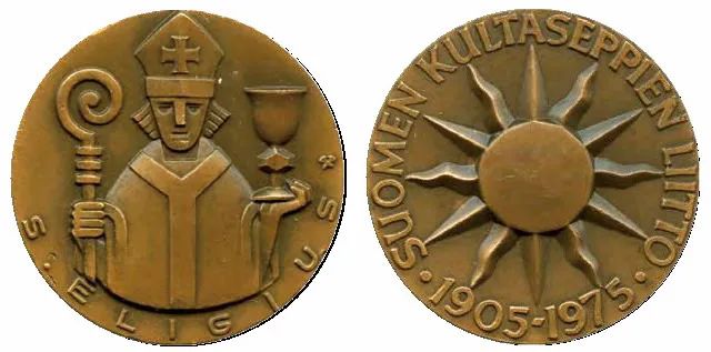 下方是圣•艾里基乌斯在造币的纪念银章。此章重5盎司,直径50毫米,银章的一面是一台螺旋式压币机,称量的天平、砝码,圣•埃卢手中拿着钱币胚料及成品。不过这里有些时空错乱。