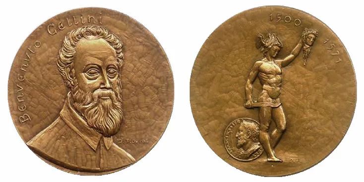 从古埃及到罗马的时代,主管艺术的缪斯和主管造币的朱诺都居于神庙。艺术与金融的联系是源远流长。文艺复兴时期,意大利佛罗伦萨画派著名写实主义画家和雕塑家安东尼奥•波拉约洛,就是金匠出身,后来改学绘画和雕塑。意大利安德烈•德尔•维罗乔,闻名于绘画和雕塑业,也是金匠出身,达•芬奇和波提切利等著名画家都是他的学生,维罗乔的学生佩鲁吉诺还是拉斐尔的老师。桑德罗•波提切利热爱绘画,他的皮匠父亲让他以金匠谋生涯,当时金匠比画家地位略高,波提切利在金匠铺做了很久。最后一心要画画的波提切利跟着著名的风流僧侣画家弗拉•菲利普•利皮学画画去了。意大利文艺复兴时期著名的画家、雕塑家和音乐家,风格主义艺术的代表人物本韦努托•切利尼(Benuveto Cellini,1500-1571)也是金匠。法国作曲家柏辽兹(Hector Berlioz)于1838年将切利尼的生平搬上舞台,创作了三幕歌剧《金匠切利尼》。下方铜章重236克,直径80毫米。铜章的正面为切利尼的肖像,背面主图是他的代表作《珀耳修斯像》。