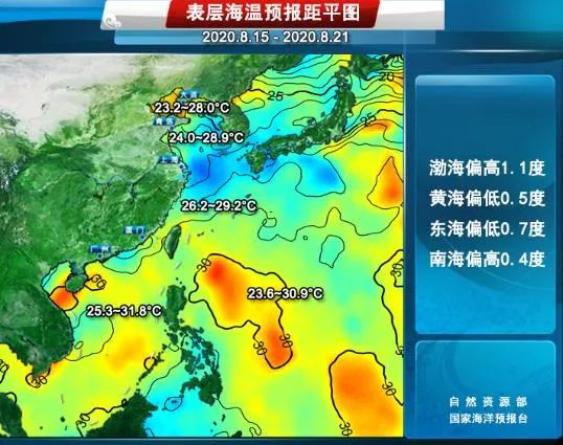 东海为26.2到29.2度,比常年偏低0.7度左右;