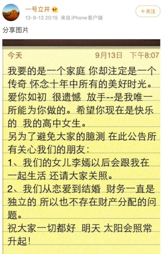 “我要的是一个家庭,你却注定是一个传奇。怀念十年中所有的美好时光。爱你如初,很遗憾。”