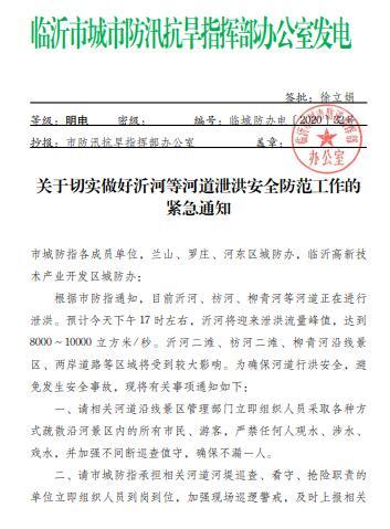目前沂河、祊河、柳青河等河道正在进行泄洪,预计14日下午 17 时左右,沂河将迎来泄洪流量峰值,达到8000~10000 立方米/秒。沂河二滩、祊河二滩、柳青河沿线景区、两岸道路等区域将受到较大影响。