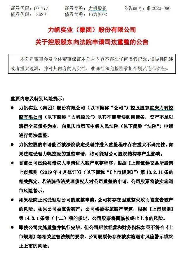 8月6日,力帆集团宣布:资产不足以清偿全部债务,其控股公司重庆力帆控股有限公司,申请破产重组。