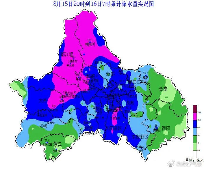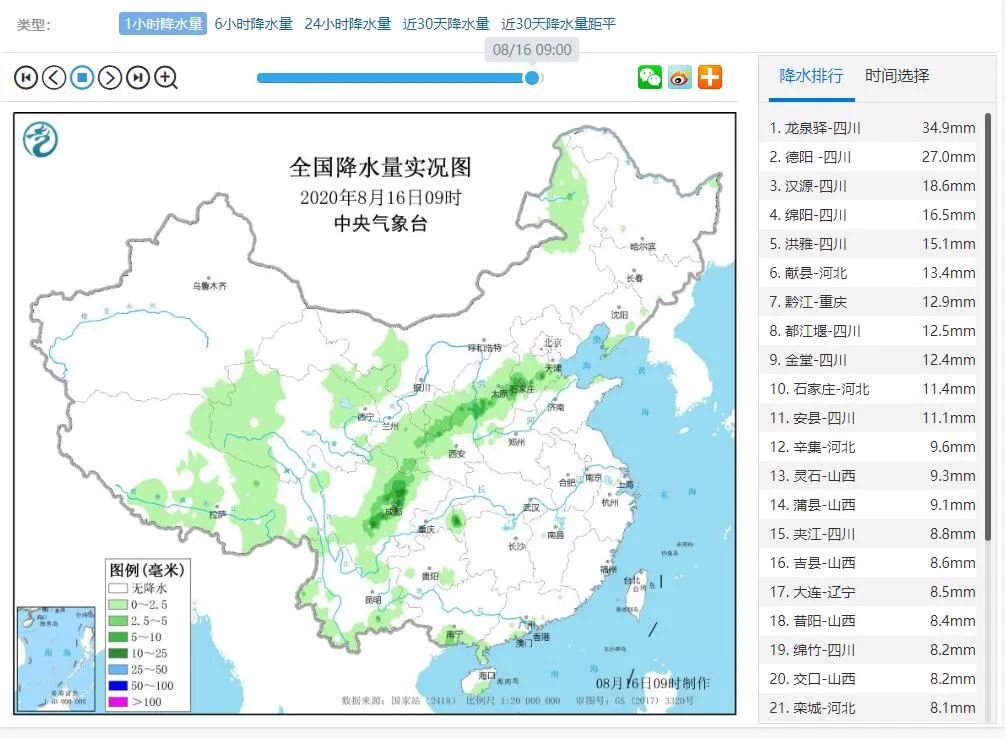 截至8月16日11时,全国降水排行榜上,四川龙泉驿、德阳、汉源、绵阳、洪雅、都江堰、金堂7个国家气象站点凭借累计24小时降水量进入前十名。