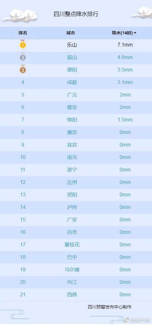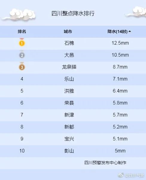 四川七地24小时降水量排全国前十