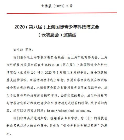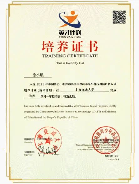 进入高一学习后,徐小航又为自己设立了一个小目标,进军“上海市中学生科技创新后备人才培养计划”,该计划在整个上海市只有70多人。他学习了许多在科学实验中实用的定性分析与方法,自学了《定性与半定量物理学》,在闵行中学老师的大力举荐与鼓励下,经过层层选拔,徐小航成功入选了“2019年上海市中学生科技创新后备人才培养计划”(英才计划)。