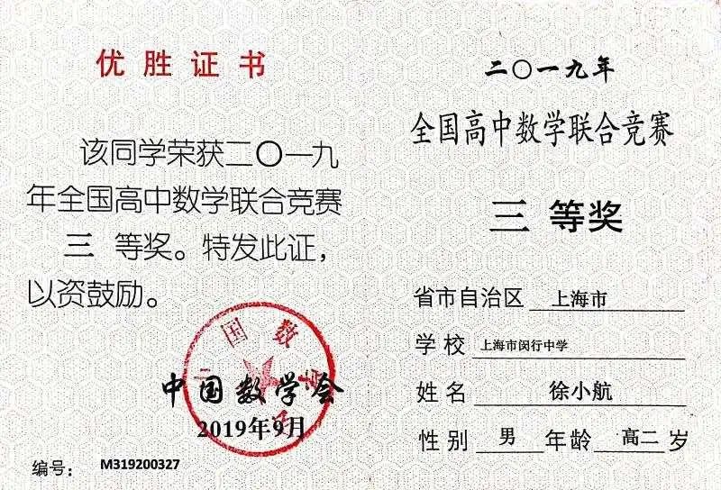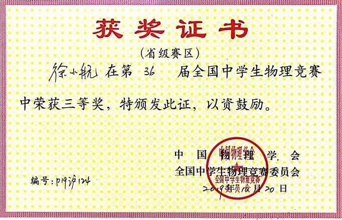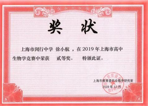 闵行中学丰富的生涯课程为学生的提供了很多学习的机会。除了校内外的学科学习外,徐小航参加了闵中科学社,在那里遇见了众多同样热爱自然科学的同学们,互相探讨和交流成了课余生活的重点。不论是学习大学物理与数学,还是热烈讨论竞赛题目,和小伙伴们思维碰撞,共同进步。这些都成了美好的回忆,也换来了回报,在闵中老师的引导和推荐下,徐小航不断斩获各类学科竞赛奖项, 分别获得了第36届全国中学生物理竞赛省级三等奖、2019年全国高中数学联合竞赛三等奖、2019年上海高中生物学竞赛贰等奖与2019年上海市中学生劳动技术竞赛实体设计项目三等奖等奖项。