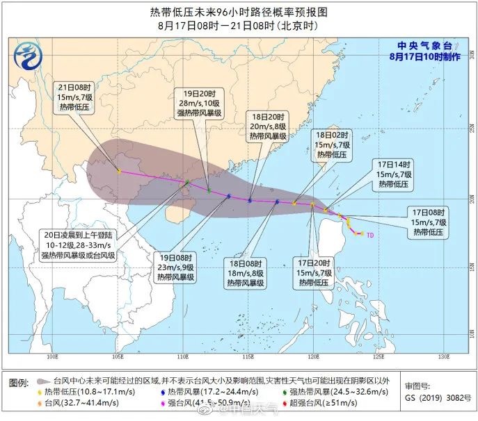17日,巴士海峡、南海东部海面有7级~9级大风;18日,我省海面风力加大到6级~8级,南海中北部海面、巴士海峡风力8级~9级,阵风10级~11级;19日-20日,南海中北部海面、我省海面、琼州海峡风力9级~11级,阵风12级;其中19日珠江口内河面有6级~8级大风。