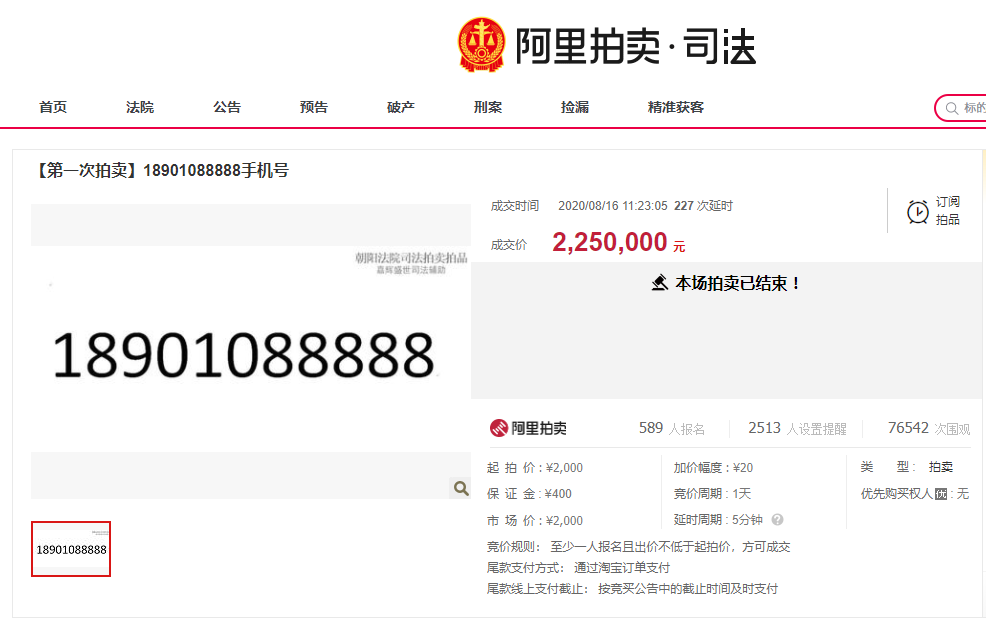 北京日报报道,一个尾号为5个“8”的手机靓号在阿里拍卖平台进行司法网拍,竞争非常激烈。