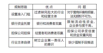 目前,规制预付费消费模式的主要思路,基本可以概括为事前的准入门槛、事中的资金监管、事后的资金担保以及行业自律等,从不同角度看都有其优点和问题。