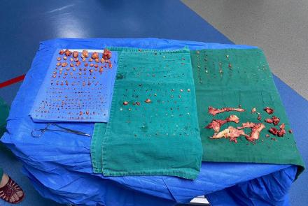 打开腹部,即使是身经百战的医生还是被她奇怪的子宫惊出一身冷汗。大量肌瘤的堆积,使得她的子宫看起来像怀孕多日一般。整场手术下来,花费了两个小时,摘除了71个肌瘤。