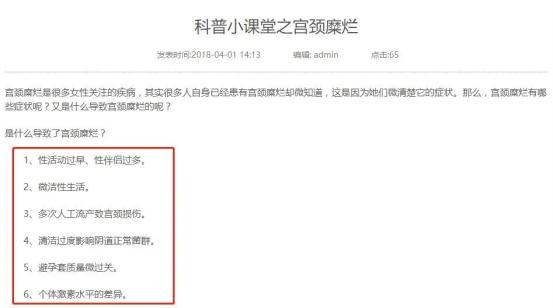 就比如某妇科医院,就曾在官网上进行过这样的「科普」:导致宫颈糜烂的原因是性生活过早、性伴侣过多和多次人工流产等等...