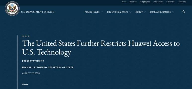 在美国国务院官网发布的声明中,蓬佩奥称,“国务院强烈支持商务部今天扩大其外国直接产品规则,这将阻止华为通过‘替代芯片生产’与‘提供用从美国获得的工具生产的现成芯片’来规避美国法律。”