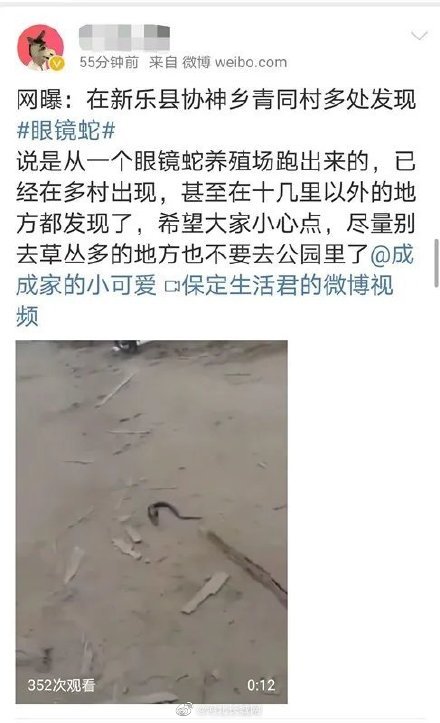 8月18日14时许,河北省石家庄新乐市外官方微博转发了新乐市自然资源和规划局发布的《网传新乐市南青同村养殖眼镜蛇跑出的情况说明》。前述说明称,经排查,南青同村共有食用肉蛇养殖户3户,只有养殖户李国庆家属反映跑出了4条,已全部捉回。8月13日以来,市自然资源和规划局、协神乡、青同村安排力量对养殖户周边及网传涉事地进行了多次大规模排查,没有发现蛇类踪迹。各部门也未接到群众被咬反映。