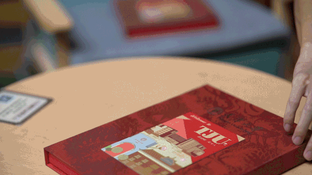天津大学的礼盒里,装了新生入学手册、逢考必过锦鲤卡套、水墨画风格精美书签、手绘地图、校徽等物件。