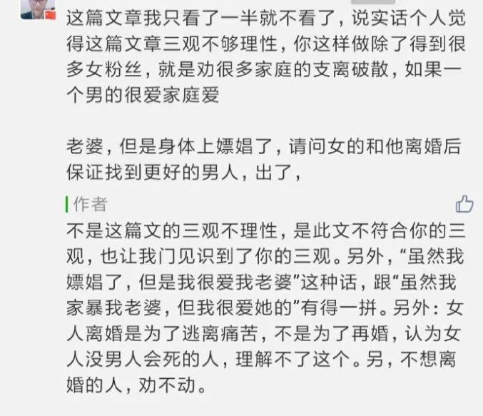 比如下面这位,就这么认为:男人嫖娼后,老婆若是跟他离婚了,都怪我劝得这些家庭支离破散。这些婚姻散架了,主要是我害的,而不是因为那些个男人嫖娼导致的。