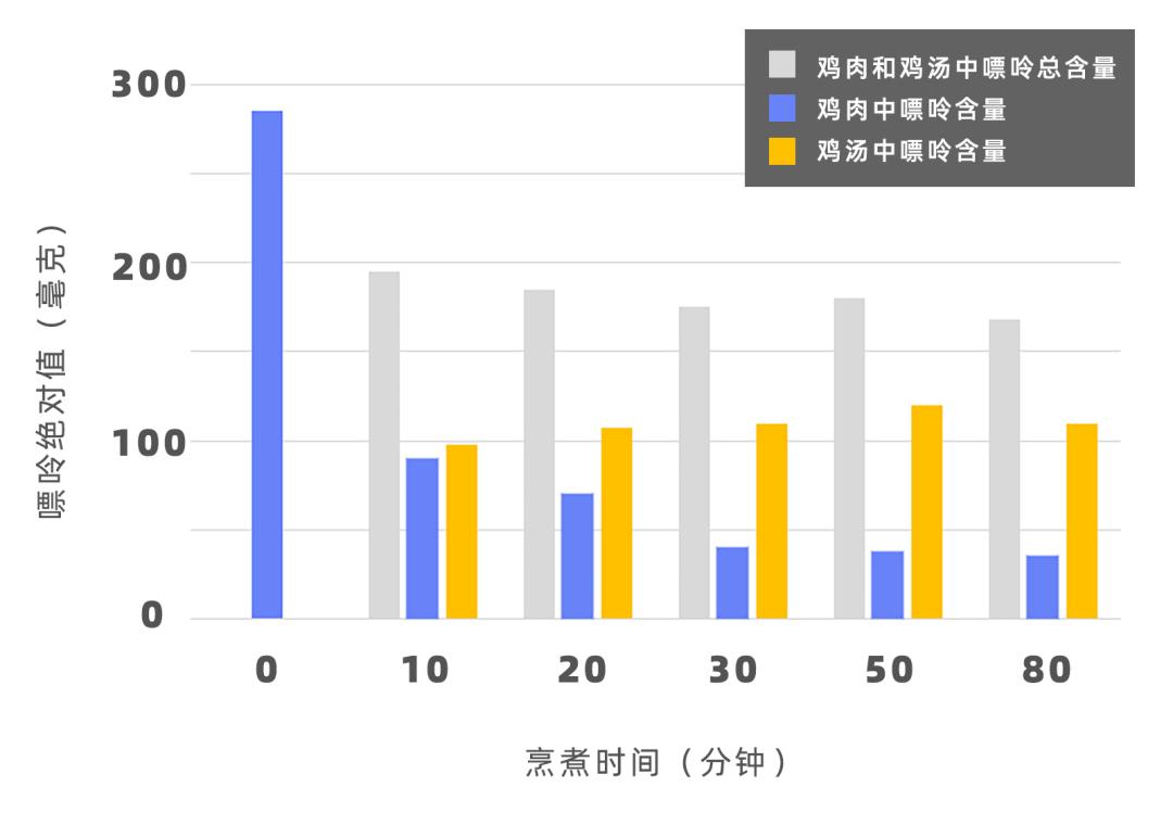 简单来说,就是烹煮过程中,鸡肉的嘌呤含量在逐步降低。而鸡汤中的嘌呤含量在逐步增多,并超过了鸡肉。