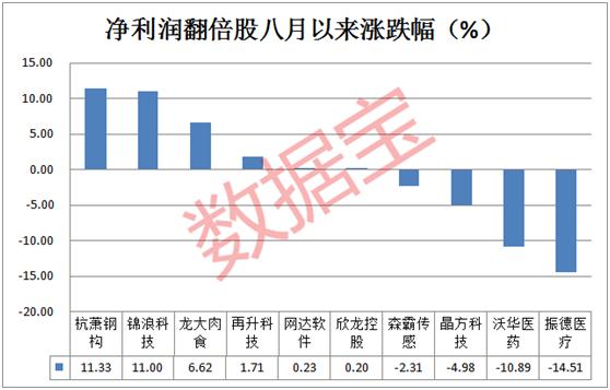 10只业绩翻倍股中,八月以来6只上涨,4只下跌,平均下跌0.16%,同期上证指数上涨13.19%,均小幅跑输大盘。回撤幅度最大的为振德医疗、沃华医药两只医药股,跌幅分别为14.51%、10.89%。