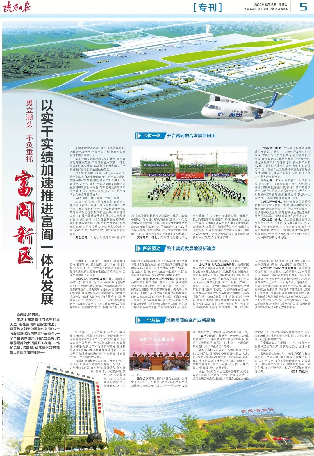 立足富阎板块资源禀赋和发展实际,确立了“军民融合发展创新示范区、重要的先进制造业基地、新型城镇化示范区、都市农业和文化旅游基地”的发展定位,打造以航空产业、先进制造业、新材料产业和“文化+”相关服务业为主导产业的“3+1”产业格局,国产民机产业发展基地等重大项目加快推进,优化了大西安产业空间布局,推动了渭北工业大走廊新发展。