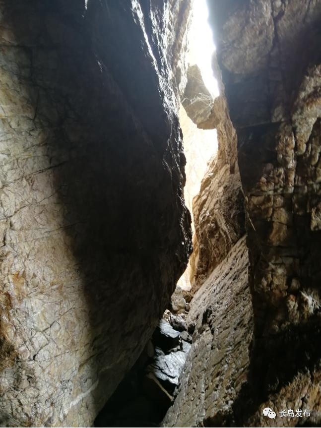 一线天也叫“楼梯”,从山上往下走有台阶,可以顺势而下到底。由于风浪侵袭,楼梯已经不存在了。现在地势比较险峻,需要从山上慢慢往下挪,低潮时穿过一片充满着神奇的沉积岩,再爬几座礁,才能到达楼梯之处。这里两峰拔地而起,只有一个人的缝隙,向上望去,有一块石头在两峰之间支撑,透出一丝亮光,能看到一线蓝天,被称作“一线天”。