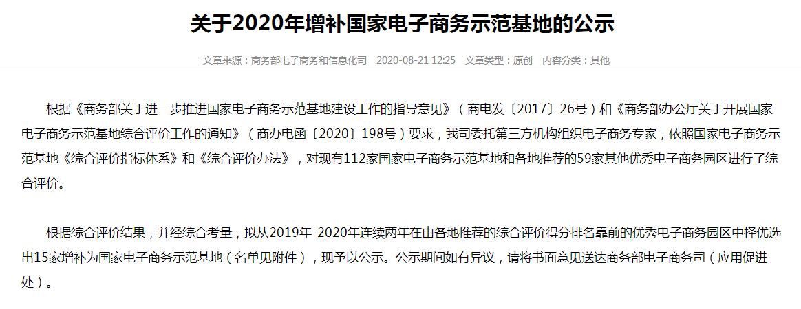 据商务部官网8月21日消息,商务部电子商务和信息化司发布关于2020年增补国家电子商务示范基地的公示,拟从2019年-2020年连续两年在由各地推荐的综合评价得分排名靠前的优秀电子商务园区中择优选出15家增补为国家电子商务示范基地,江苏信息服务产业基地等入围。