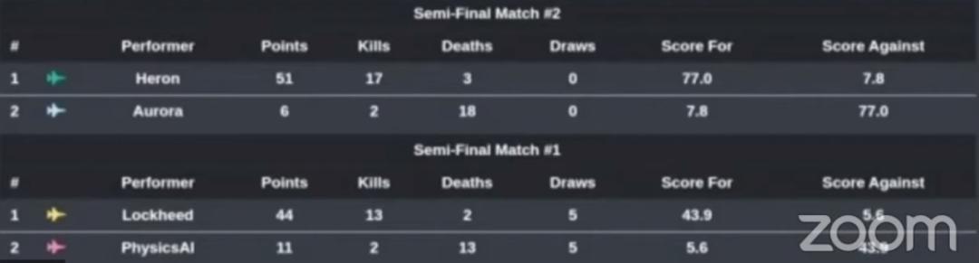 8 月 19 日,八支参赛团队展开循环赛,最终四支团队进入半决赛(Semi-Final Match),分别为 Aurora Flight Sciences、Heron Systems、Lockheed Martin 和 PhysicsAI。