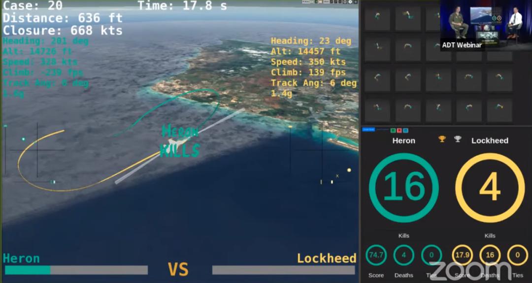 在决赛中,Heron Systems 以 16:4 的绝对优势战胜了 Lockheed Martin,成为了此次挑战赛的冠军团队,并最终与一所武器学校的 F16 飞行教官 Banger 展开人机大战。