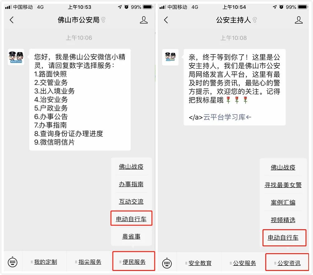 2、在“佛山市公安局”点击底部菜单【便民服务】,选择【电动自行车】业务;在“公安主持人”点击底部菜单【公安资讯】,选择【电动自行车】业务。