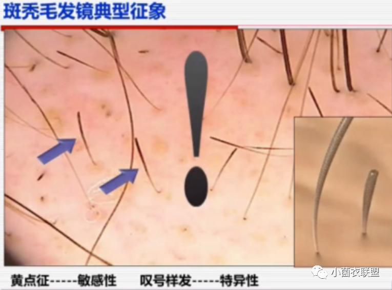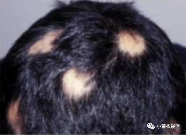 斑秃,俗称“鬼剃头”,表现为无明显诱因、无意中发现的在头部突然出现的圆形或椭圆形脱发斑,脱发处皮肤光滑,脱发区边缘处可见松而易脱的头发,有的已经折断,在皮肤镜下或将毛发拔出时可见“上粗下细”的“惊叹号”状发,且毛发下部有色素脱失。严重者短期内多个斑秃区域融合出现全部头发脱落,称为“全秃”;如伴随眉毛、睫毛等体毛同时脱落,称为“普秃”。