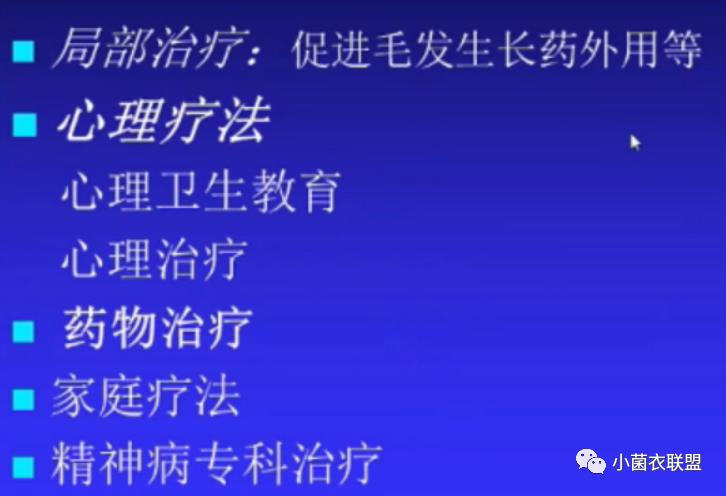 拔毛癖终归是一种心理疾病,拔毛之前通常紧张感增加,拔完之后有如释重负感或满足感。该行为发生的原因与紧张心理冲突等因素有关,多为下意识缓解紧张的一种方式,部分理论认为该症是儿童期强迫症的一种表现方式。一般拔毛癖患者发病前多有导致情绪不稳的诱因,如与父母分离,学习压力过大,受到老师批评,遭到父母打骂,父母性格不稳,管教过分严厉,缺少亲情爱护等。因此,解铃还须系铃人,找到真正的原因并与孩子进行心理沟通是拔毛癖的最佳治疗方法,同时建立良好的家庭关系,增进儿童的安全感,消除心理压力可以有效的减少孩子拔头发的行为。适当时可以口服镇静、抗抑郁药物。