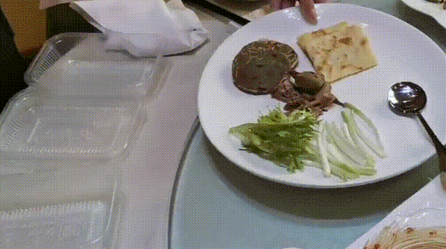 因为是提前预订的,到了饭店没等位,我们直接开餐。盛菜的盘子很大,满满一桌。我拿起筷子尝了一下招牌菜,却感觉除了酸没别的啥味道,又尝了尝汤和肉片也不香。一连吃了几个菜,口感都不太好。团友评价也是如此。大伙儿只好找点主食吃,挑挑拣拣地吃了几口菜。