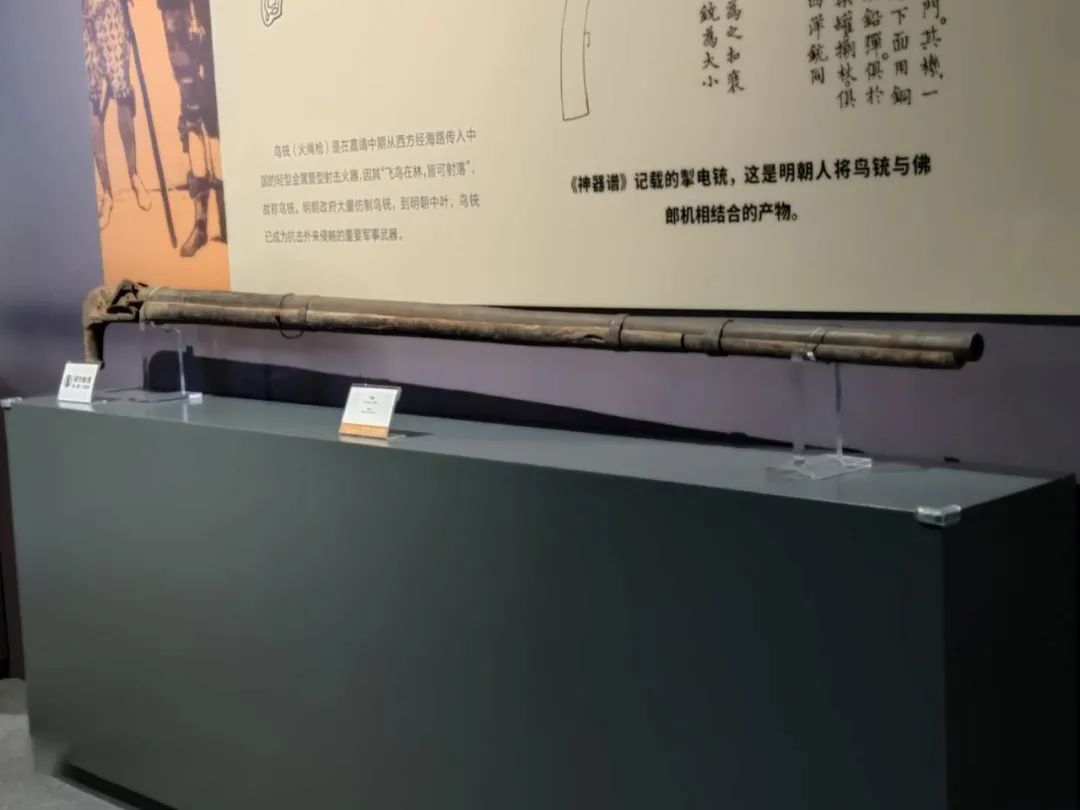 展厅中的“鸟铳”由铳管、瞄准装置、枪机、弯形铳托等部分构成,“鸟铳”铳管长度与口径之比大约在50:1-70:1之间,铳管长可以使火药在铳膛内充分燃烧,使弹丸获得更大的初速度,射中更远的目标。展厅“鸟铳”的枪机是一个金属弯钩,一端固定在枪身上,另一端是一个夹钳火绳的机头。此外,“鸟铳”还有瞄准装置,这是古代手铳所不具备的装置。其瞄准装置一般有准星和照门,提高了“鸟铳”的命中率和杀伤力。