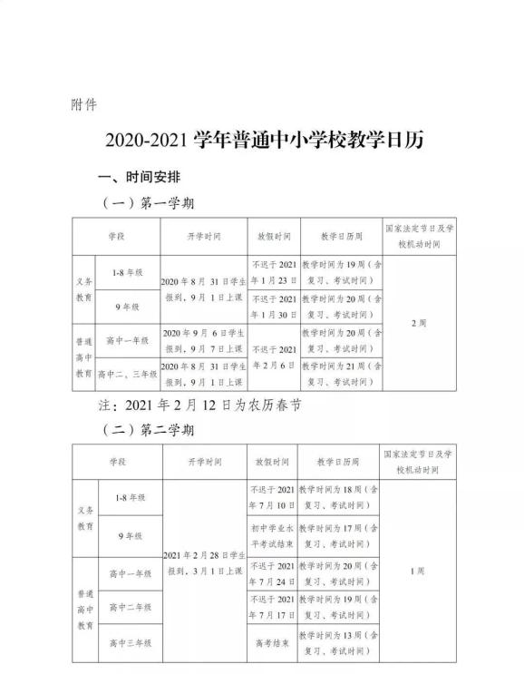 义务教育1—8年级学生第一学期于2020年8月31日报到,9月1日上课;寒假时间不迟于2021年1月23日;第二学期于2021年2月28日报到,3月1日上课,暑假时间不迟于2021年7月10日。