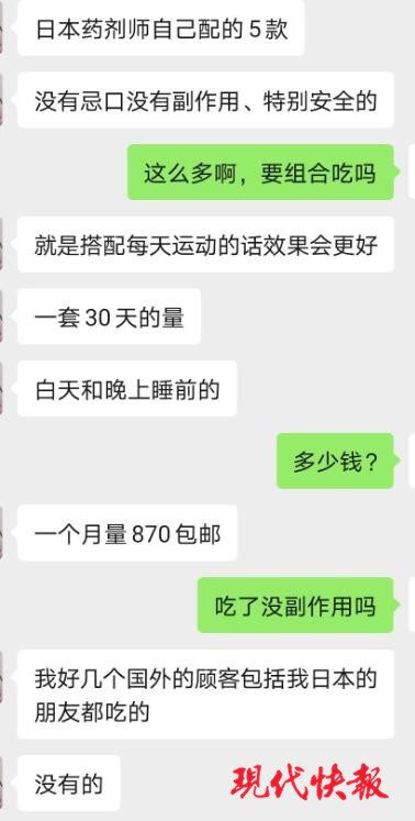 通过社交软件上的联系方式,记者添加了几名代购的微信。“我发的那个日本的,谁吃谁见效。一个月的量,每天早上3粒,晚上2粒,690元。”“没有忌口,特别安全,搭配运动的话效果会更好。”在代购的口中,这些药成了“靠谱的减肥药”。