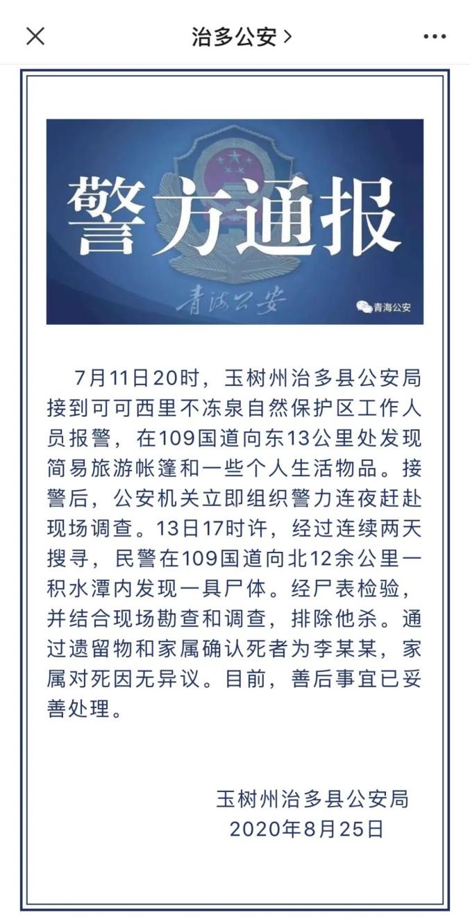 原标题:《警方通报:在可可西里失联超45天的95后小伙已离世》