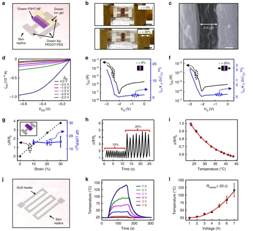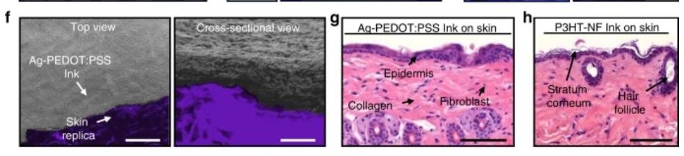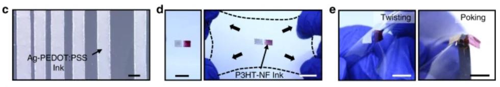论文中写道,研究人员会通过Ag(银)和PEDOT:PSS溶液(一种导电率很高的高分子聚合物水溶液)混合来制备导电油墨,通过3:7体积混合的C10H12(四氢萘)和C6H10O(环己酮)来制备P3HT-NF半导体油墨,通过PVDF-HFP(聚偏氟乙烯-六氟丙烯),[EMIM] [TFSI](1乙基3甲基咪唑双三氟甲磺酰亚胺盐)和C3H6O(丙酮)以1:4:7的重量比混合制备离子凝胶电介质油墨。