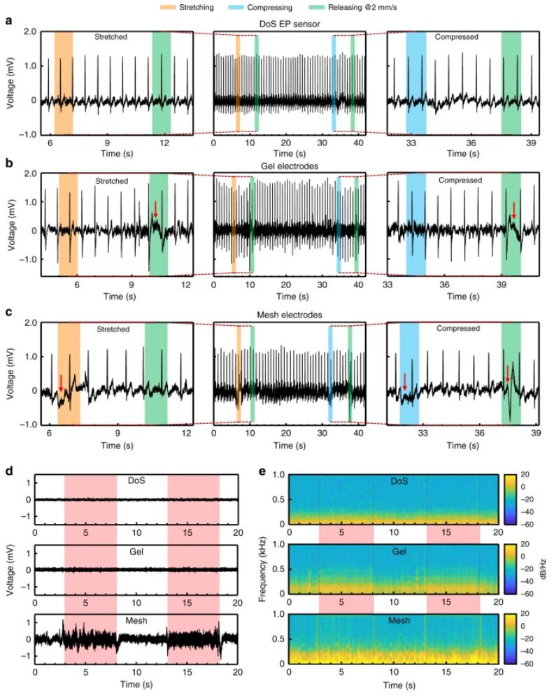 因为通过以往的研究已知较薄的传感器不太容易受到运动伪影的影响,因此研究人员在针对运动伪影影响的测试中,用前文提到的包括Dos在内的三种电极测试了皮肤在被间隔性拉伸或收缩,以及处于振动条件下的心电图信号。