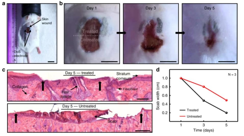 例如,士兵在战场上遭到单片袭击刺破皮肤,一般需要几天到几个月的时间才能完全痊愈。而此前有研究表明,对于皮肤的脉冲电刺激可以应用于促进伤口愈合。