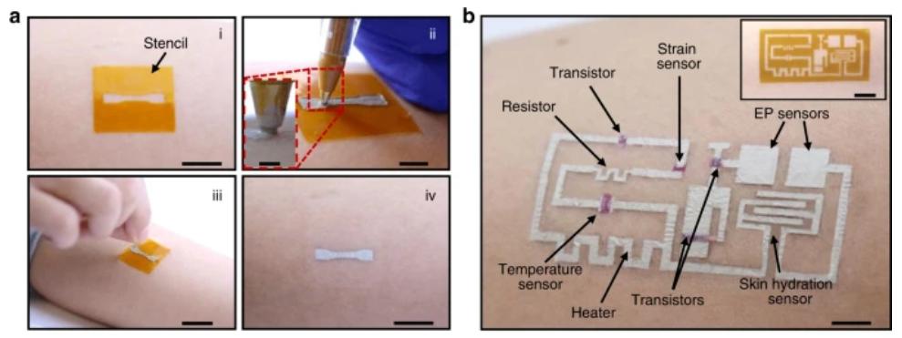 那么这种新奇的“贴皮”式电子产品是如何画上去的?用电子墨水画上电路图就真的可以替代可穿戴器件吗?它是否能适应人类皮肤超强的延展性?电路怎么能帮助伤口愈合呢?
