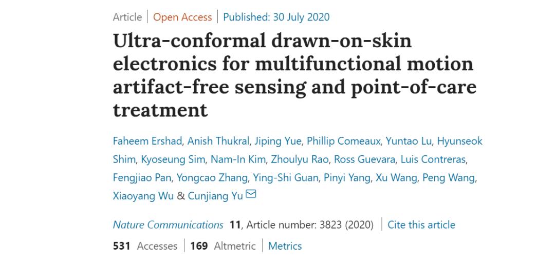 这项研究以《超保形皮肤电子设备,用于多功能运动无伪像感测和即时护理(Ultra-conformal drawn-on-skin electronics for multifunctional motion artifact-free sensing and point-of-care treatment)》为题发表在了《自然通讯(Nature Communications)》杂志上。