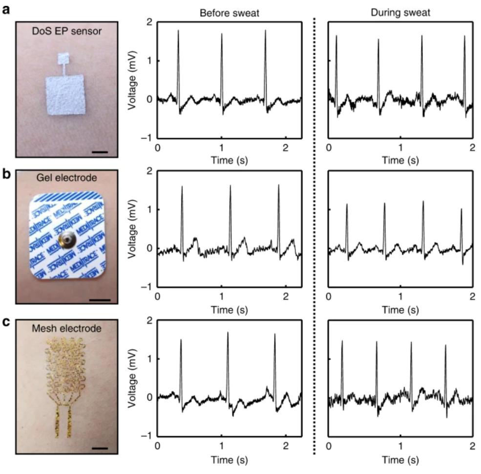 通过对7小时内的耐用性对比发现,Dos传感器获得的ECG信号(心电信号)在所有测量时间点上都相对一致,其在皮肤出汗情况下测试、耐久测试以及与皮肤的黏着力测试中都表现出超出其他器件的性能。