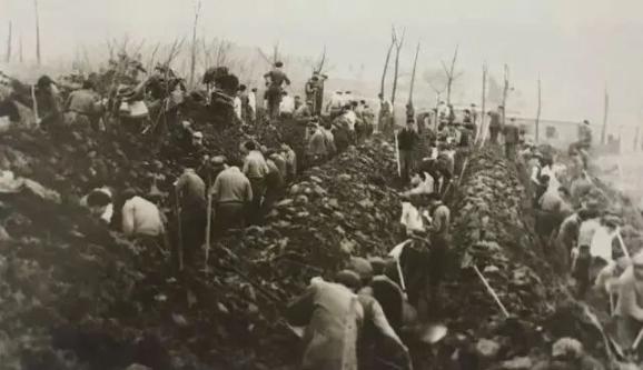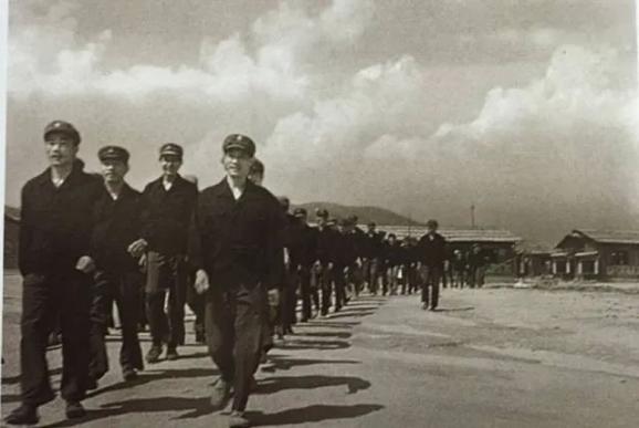 1982年,战士们戴军帽,穿工服,列队走向工地。(摄影:周顺斌)