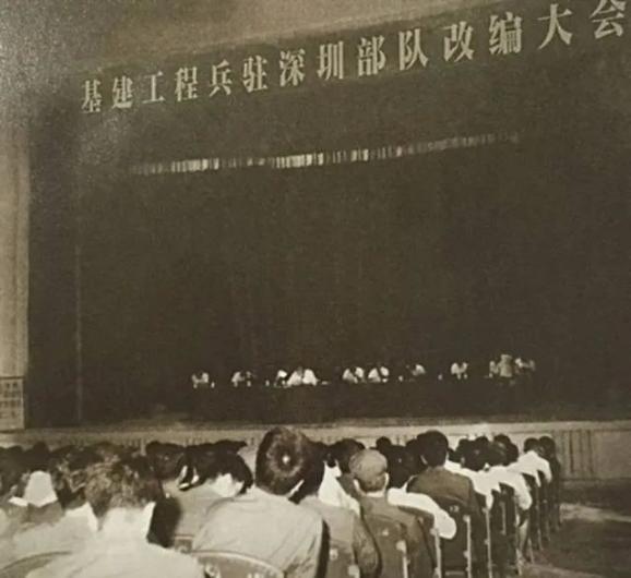1983年9月19日,深圳戏院。深圳市委、市政府召开“基建工程兵驻深圳部队改编大会”,会议宣布:自1983年9月15日起,二万基建工程兵集体转业改编为深圳市属企业。图为大会主席台。(摄影:杨洪祥)
