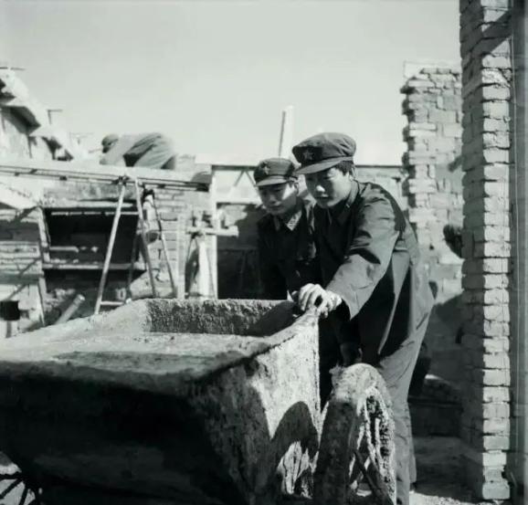 后来,战士们用小型的混凝土车运输砂浆,工效大为提高。(摄影:杨洪祥)