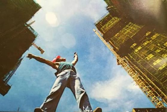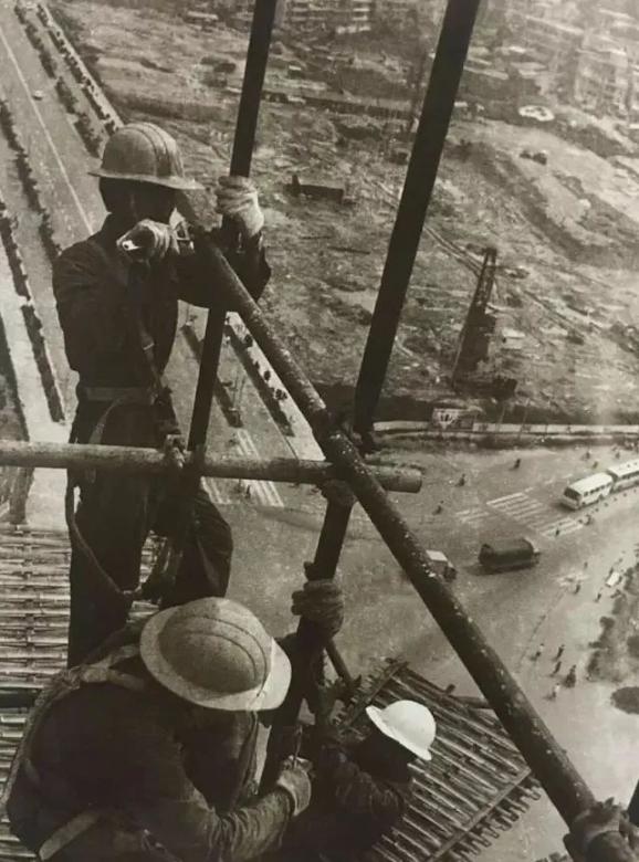 1983年10月,建设中的红岭大厦,位于深南大道与红岭路十字路口。战士们在高空作业,看下去的对面空地上后来建起了深圳大剧院。(摄影:杨洪祥)