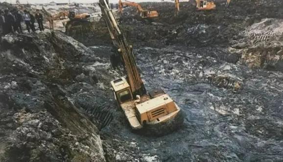 新洲河河床拓深、挖淤泥,在巨大的挖掘机下面大面积铺上钢板才能顺利进行施工。(摄影:陈致忠)