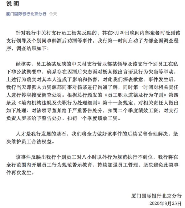 8月24日,厦门国际银行北京分行发布“说明”表示领导行为欠妥,对该领导董某给予严重警告处分,扣罚二个季度绩效工资;对支行负责人罗某给予警告处分,扣罚一个季度绩效工资。